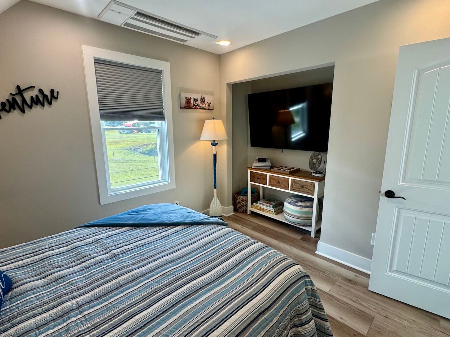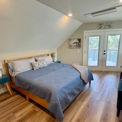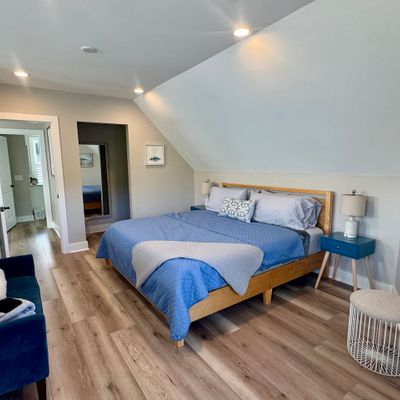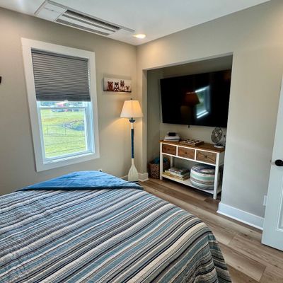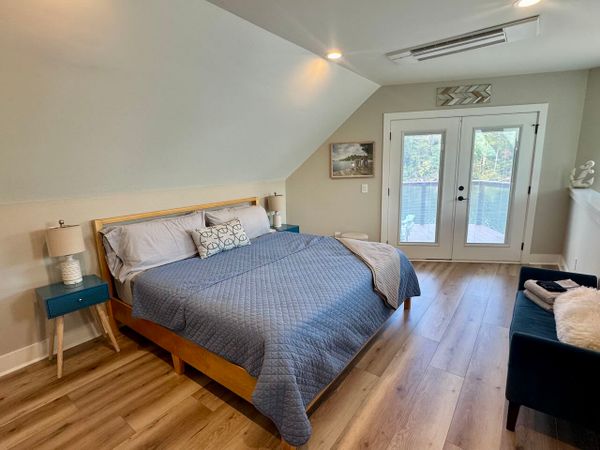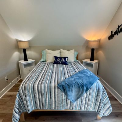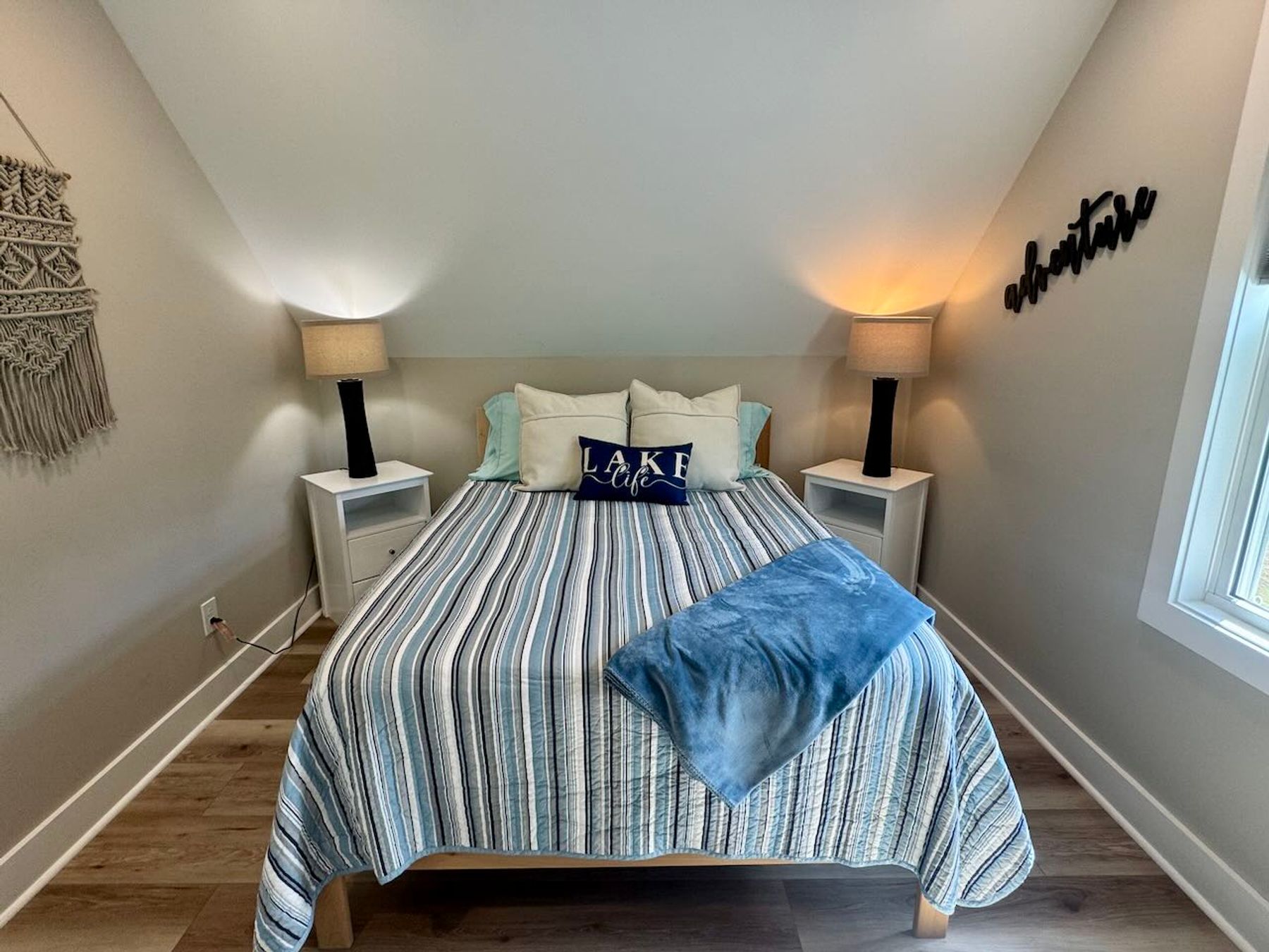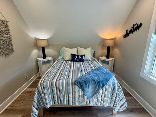 This inviting rental cottage comfortably accommodates up to six guests with its two bedrooms, each featuring a queen-sized bed. The main level, accessible via stairs, houses one bedroom and a bathroom, with the additional bedroom, game room, and another bathroom located on the upper level. Both levels are well-equipped for convenience and comfort, featuring walk-in showers in the bathrooms, a central vacuum system, and laundry facilities including a washer and dryer. The kitchen is thoughtfully appointed with all necessary cooking equipment, a farmer sink, and a dishwasher. For outdoor enjoyment, the property offers street side and water side decks on the main level, an upper deck off the master bedroom, a BBQ grill, and ample outdoor seating. After sunset, canned lights provide plenty of illumination, and a gas log fireplace creates a cozy atmosphere on cooler evenings.
